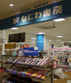 現在なにわ書房は円山地区に2店舗、行啓通りに1店舗を展開中。ここマルヤマクラス店がキーショップのような位置づけだ。店頭を飾る壁面ディスプレイは多面的に表紙を見せることができるインテリアタイプ。折々のフェアを告知すると同時に店を盛り上げる役目も果たしている。